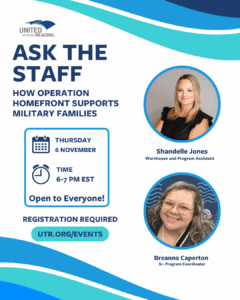 Join United Through Reading’s Warehouse & Program Assistant, Shandelle Jones, and Operation Homefront’s Sr. Program Coordinator, Breanna Caperton, for an inspiring and informative Ask Friends of the Staff that highlights the powerful partnership between our nonprofits.